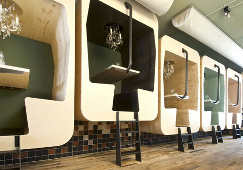 Klienci restauracji jedzą zamówione dania w drewnianych, prostych kabinach, do których wejście wymaga pokonania 3-5 stopni na małych drabinkach. Studio Tjep, autorzy projektu przyznają, że celowo nie stosują kolorowych i połyskujących wykończeń pozostawiając czysty materiał na wierzchu, aby dostosować atmosferę miejsca do aktualnych warunków ekonomicznych na świecie a tym samym do wymagań klientów.